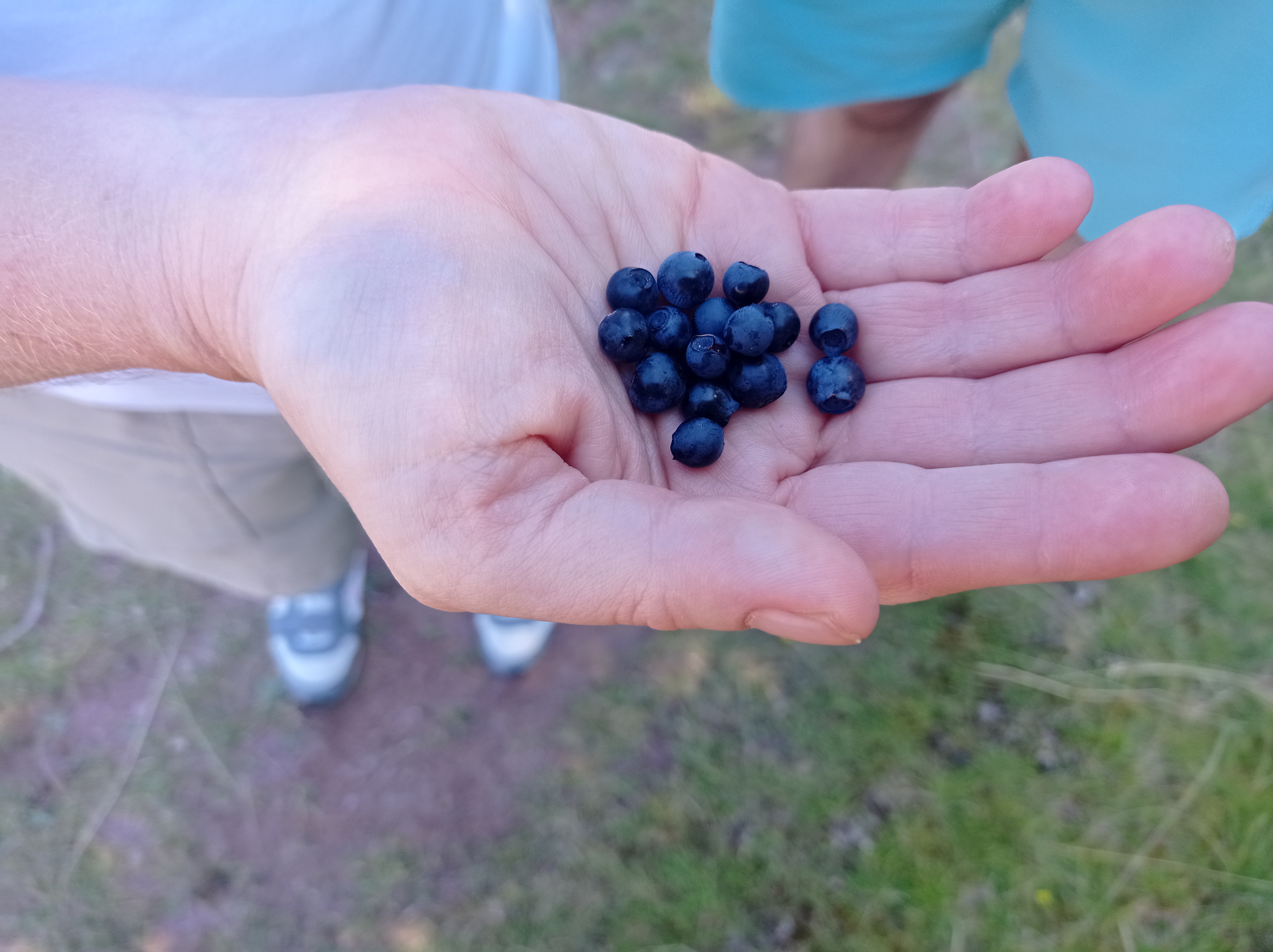 Nous reprenons notre marche, en quête d’une nouvelle aventure. Nous trouvons un champ de myrtilles, ces petits fruits bleus et sucrés qui poussent à l’état sauvage dans les montagnes. Nous décidons de faire une cueillette, pour le plaisir des yeux et des papilles. Nous remplissons nos gobelets et nos poches de myrtilles, en prenant garde de ne pas en écraser ou en manger trop. Nous faisons attention à ne pas tacher nos vêtements ou nos mains avec le jus des fruits.