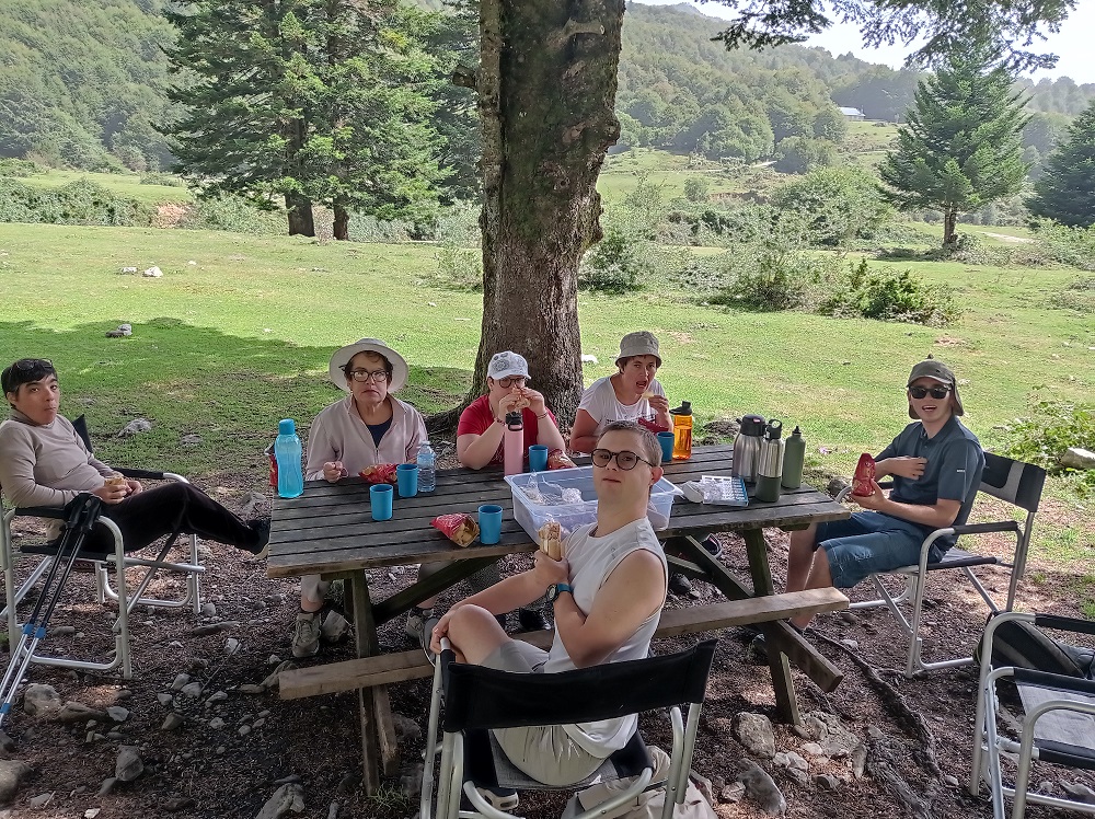 Nous sommes un groupe de six résidents (Lisa, Catherine, Audrey, Christelle, Florian,,Bixente,) accompagné par Christian, notre éducateur sportif. Nous avons décidé de profiter de cette belle journée pour faire une escapade au plateau de Sanchèse. Nous sommes partis le matin du 5 septembre 2023 vers 10h30, après avoir préparé nos sacs à dos et nos pique-niques. Nous avons suivi la piste empierrée qui monte doucement à travers la forêt de hêtres. Après environ une heure de marche, nous avons atteint le plateau et franchi la passerelle en béton qui enjambe le ruisseau d’Anaye3.